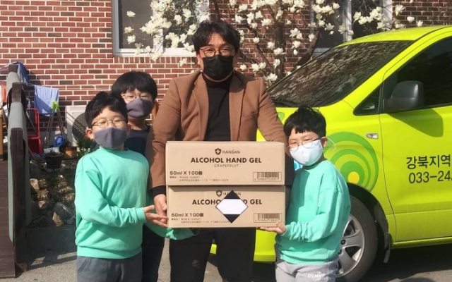 세 자녀는 함께 땀흘려 직접 손소독제를 전달하며